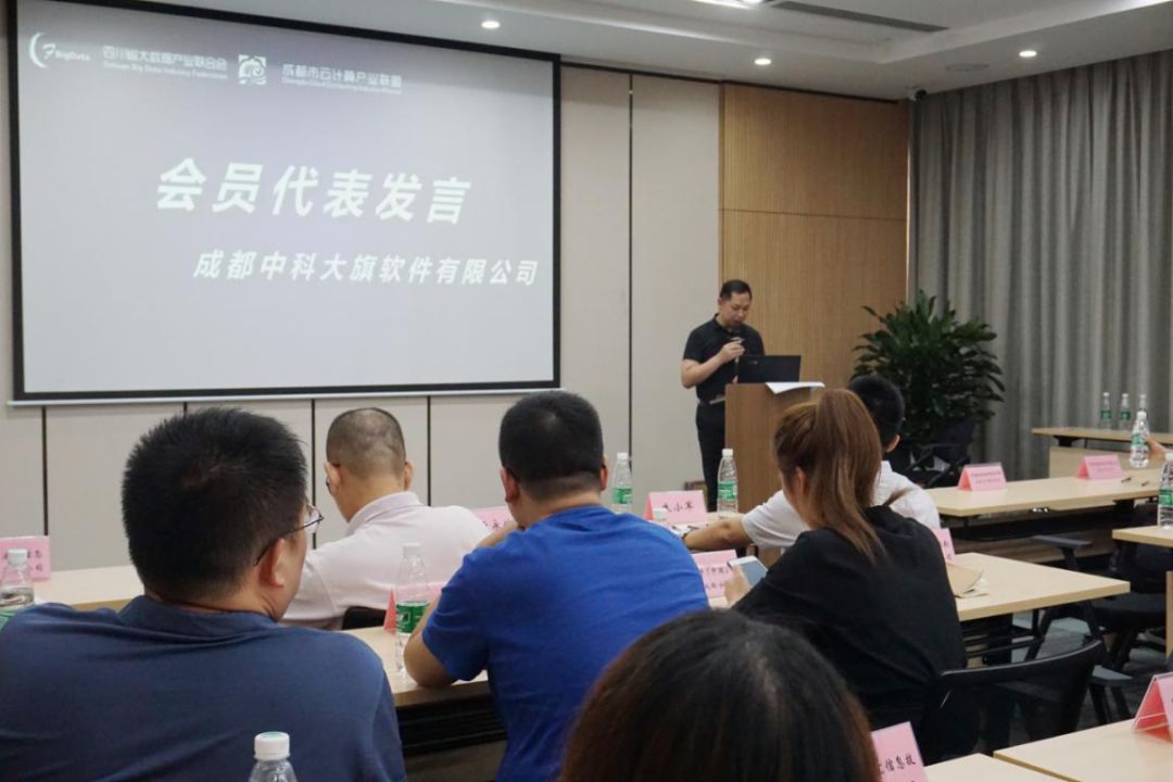 会员单位代表成都中科大旗软件股份有限公司在会上发言,企业应该重视行业标准建设和知识产权保护,以中科大旗为例,2019年中科大旗在川数联帮助下通过DCMM评估,标志着中科大旗在推进大数据国家标准方面的工作向前迈进了坚实的一步。
