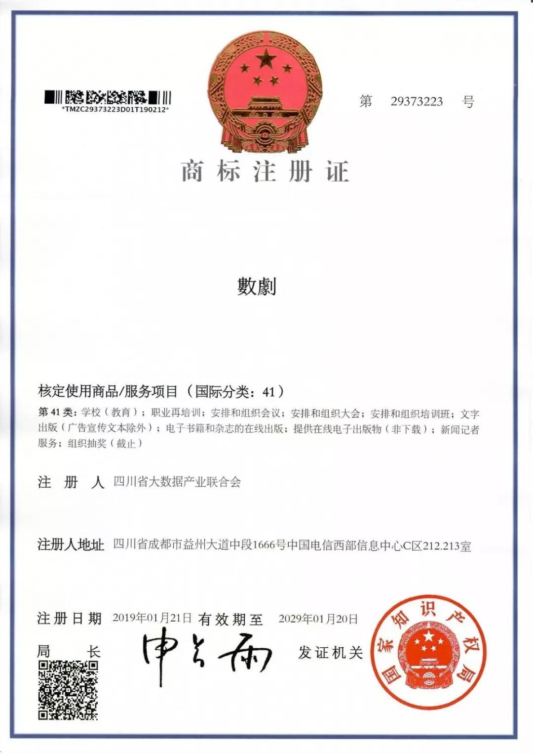 申请“數劇”、“錦繡數劇”文字及图形的商标注册是四川省大数据产业联合会为了保护川数联在大数据行业树立服务品牌形象,以及所取得的良好社会声誉,同时规范协会各会员企业、相关从业者在开展行业相关服务及技术研究时的行为,防止滥用、冒用和不正当使用“數劇”、“錦繡數劇”及图形的标志。以维护四川省大数据产业联合会的品牌形象,建立行业与企业的市场诚信,促进大数据行业健康、有序的发展。