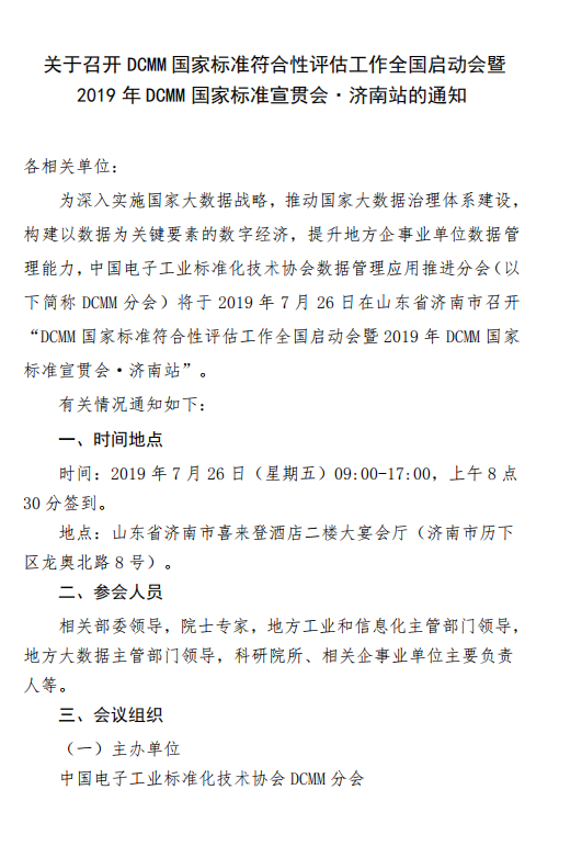 为深入实施国家大数据战略,推动国家大数据治理体系建设,构建以数据为关键要素的数字经济,提升地方企事业单位数据管理能力,中国电子工业标准化技术协会数据管理应用推进分会(以下简称DCMM分会)将于2019年7月26日在山东省济南市召开“DCMM国家标准符合性评估工作全国启动会暨2019年DCMM国家标准宣贯会·济南站”。