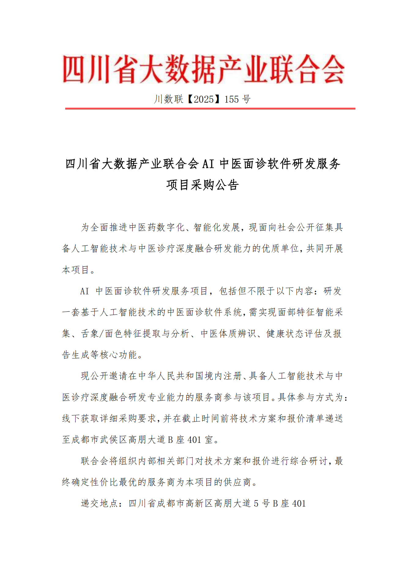 四川省大数据产业联合会AI中医面诊软件研发服务项目采购公告