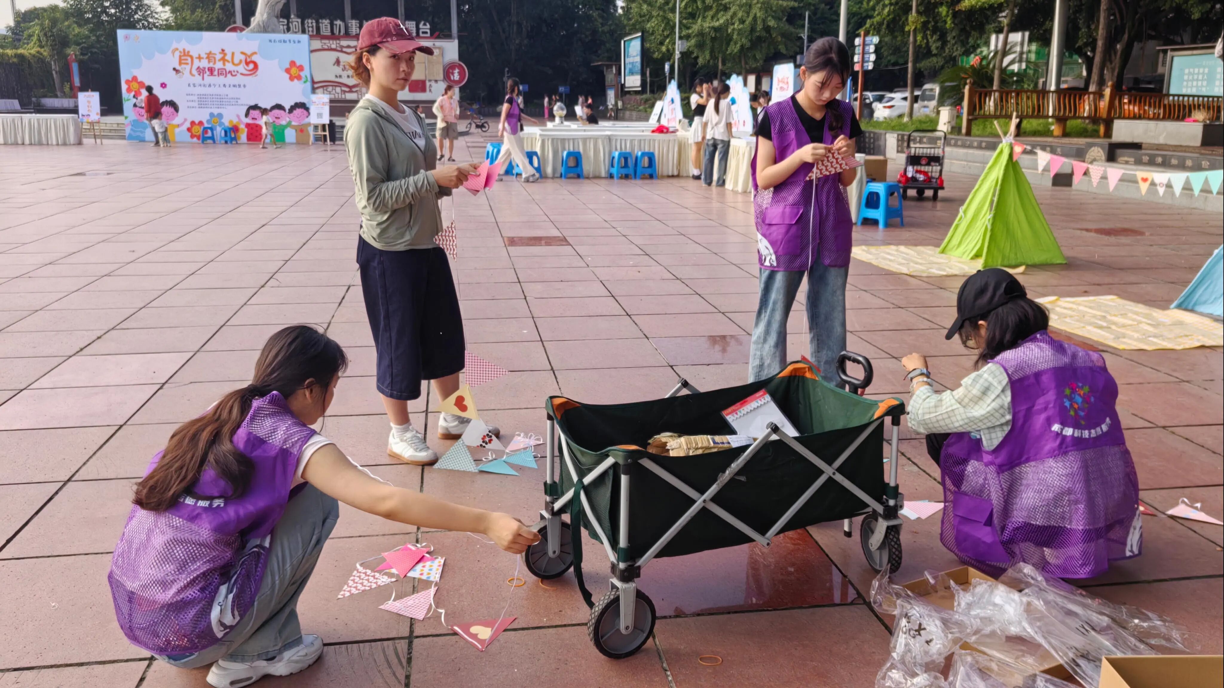 活动开始前,四川省大数据产业联合会“数剧先锋”志愿者们(以下简称“志愿者”)早早抵达活动现场,提前布置游戏点位和跳蚤市场摊位,热情迎接每一位参与活动的家庭。