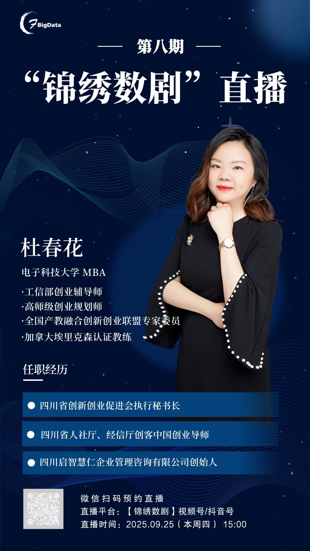 当传统企业遇上大数据,如何突破需求碎片化成本高企的困局?怎样用数据驱动重构价值链找到创新增长路径?第八期 “锦绣数剧” 公益直播重磅来袭!联合会特邀工信部创业辅导师高师级创业规划师;四川省创新创业促进会执行秘书长杜春花,为传统企业绘制“大数据+创新”的落地蓝图,9 月 25 日 15:00 锁定直播间